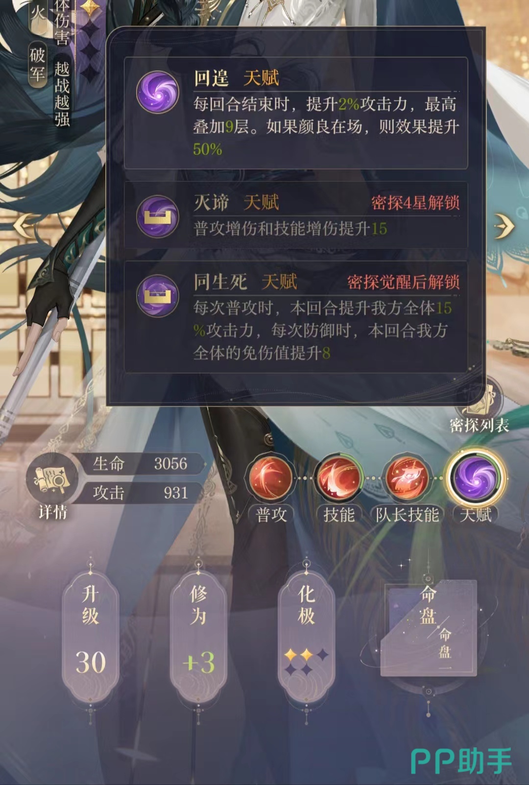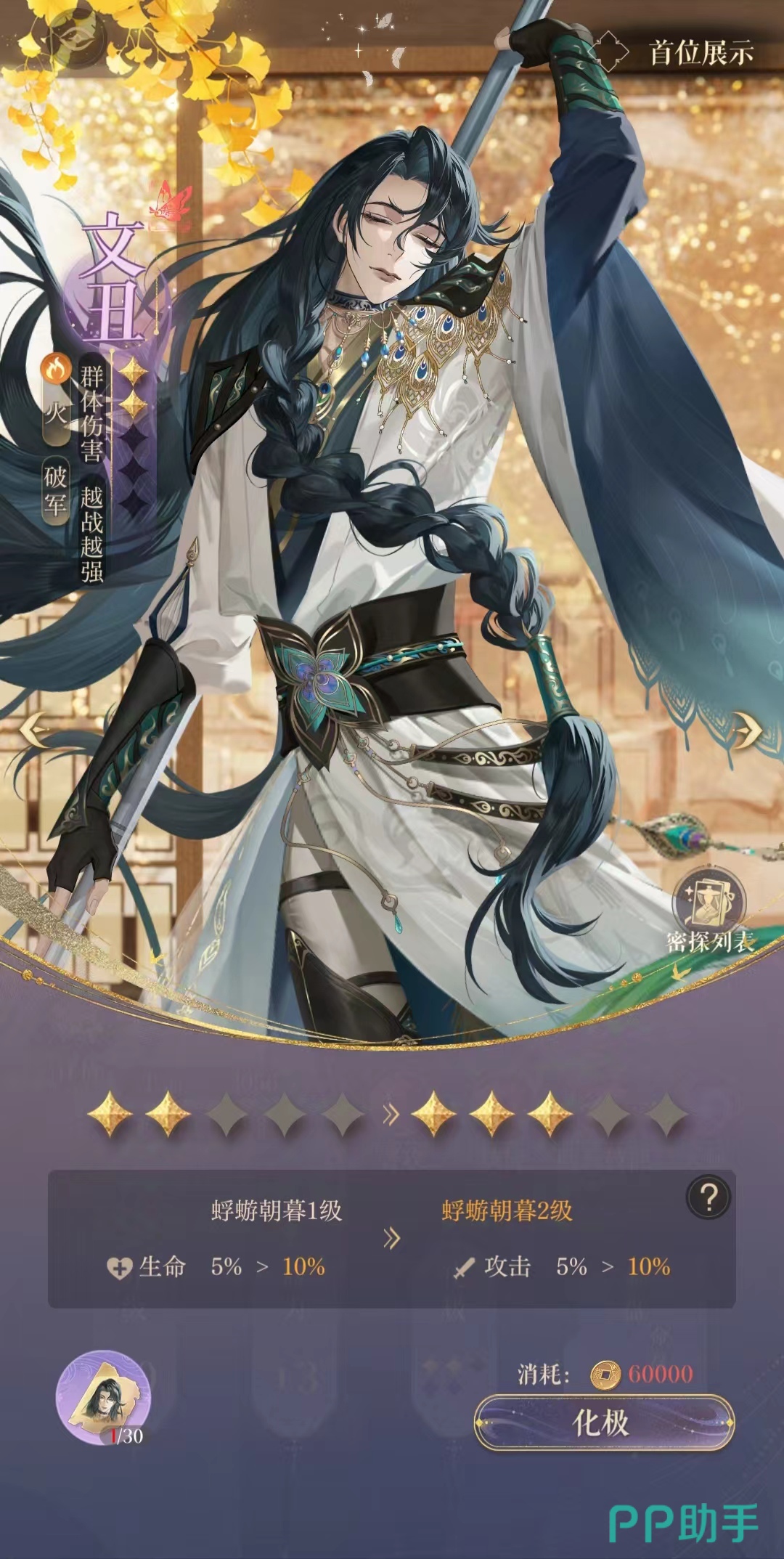 基于文丑越战越强这密探特性,小编在这里建议各位殿下,优先对文丑进行升星培养,通过升星,实现文丑自身生命值和攻击力的双重提升,并在升至三星时提升文丑自身大招技能蜉蝣朝暮,大幅增强文丑自身的群体攻击伤害,缩短攻击输出总时长,尽可能达到速战速决的效果。