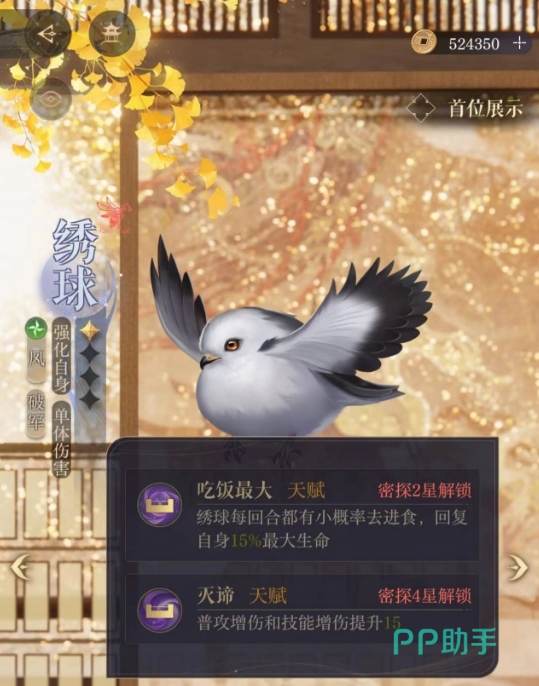 如果玩家打算培养这个宠物类型的密探,那么在成功突破到2星时,就能解锁“吃饭最大”这个天赋,每回合都有小概率进食,回复自身15%的最大生命,而如果能将绣球突破到4星,则可解锁“灭谛”天赋,使得普攻增伤和技能增伤都能提升15点。