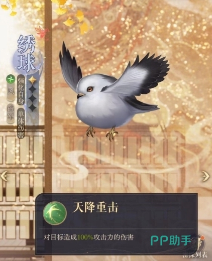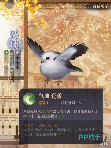 在技能方面,绣球的普攻技能为“天降重击”,能对目标造成100%的攻击力伤害,虽然这个数值看起来还不错,但考虑到它的基础攻击力只有72,所以实际的伤害效果可能并不如大家所预期的那样,而它的技能“气血充盈”,效果为能对目标造成210%的攻击力伤害,并且当自身生命值大于80%时,伤害还能额外提升50%,因此可让它在保持高生命值的同时,也能发挥出强大的输出能力。