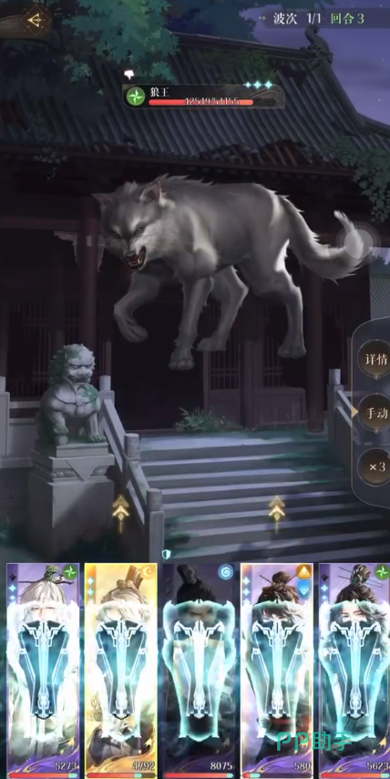 从第4回合之后,重复以上的几个步骤即可,打法重点就是观察狼王的三能量大招释放时机,卡在狼王放大招之前,用颜良的嘲讽更吸引火力,然后再使用史子眇回血大招补状态,两者顺序不可颠倒。