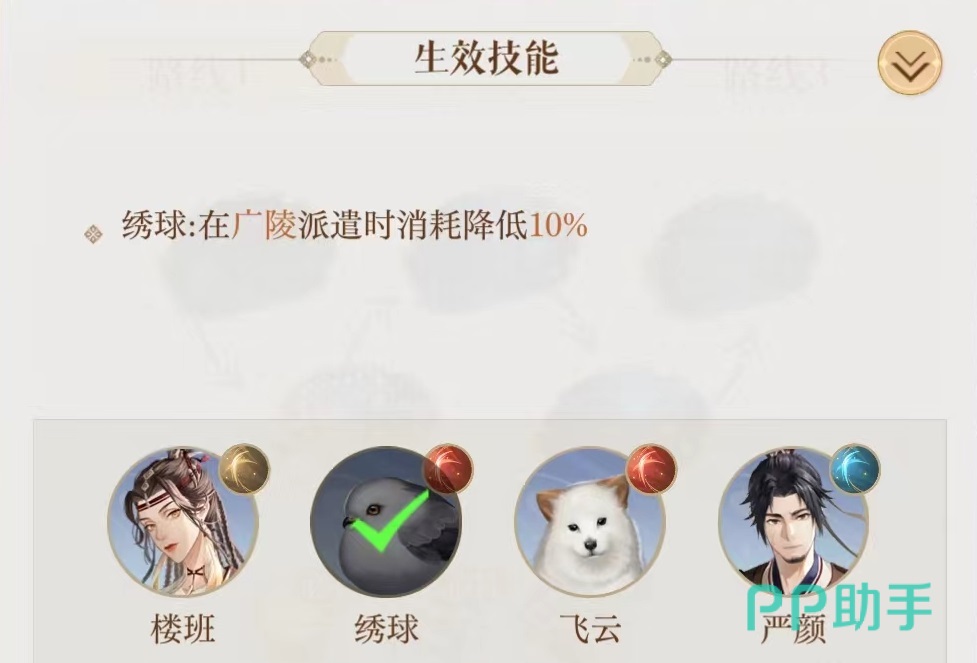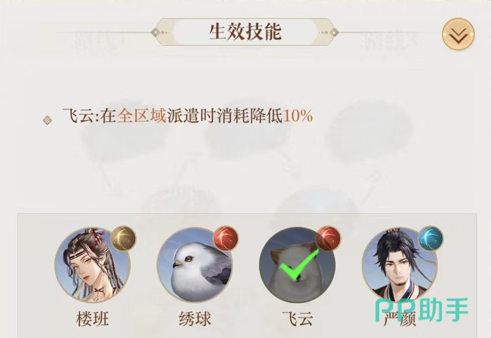 目前性价比最高的派遣是洛阳据点派遣,可以获得白金币和鸟食,这游戏里少数可以零氪获得白金币的途径。派遣时选择的密探也有很大的区别,有一些密探有独特的技能,例如楼班、绣球、飞云、严颜等,都有着自身的特点。选择这些密探,在派遣之后可以获得额外的奖励。例如绣球在广陵派遣时可以降低10%的消耗,飞云在全区域派遣时都可以降低10%的消耗等。