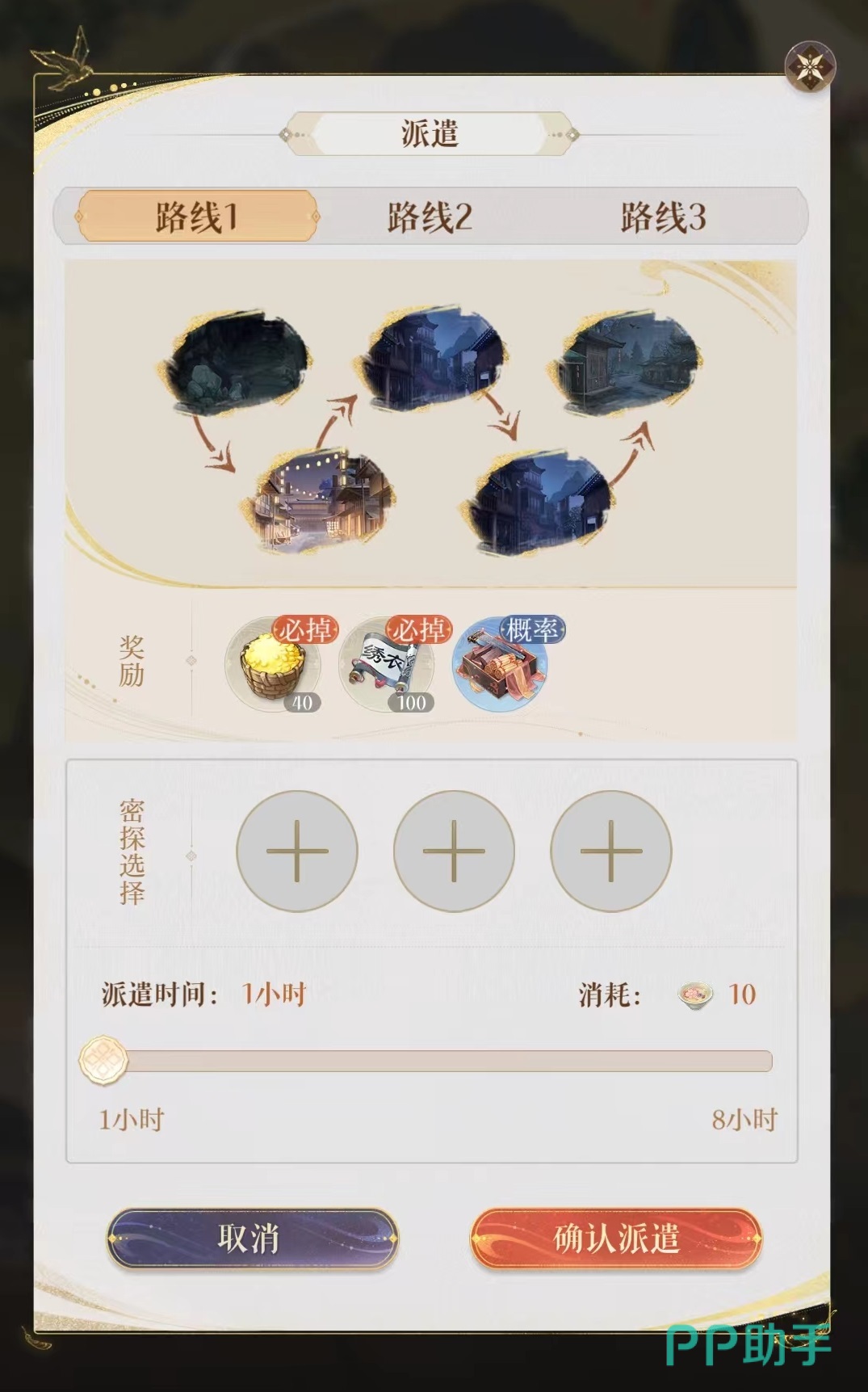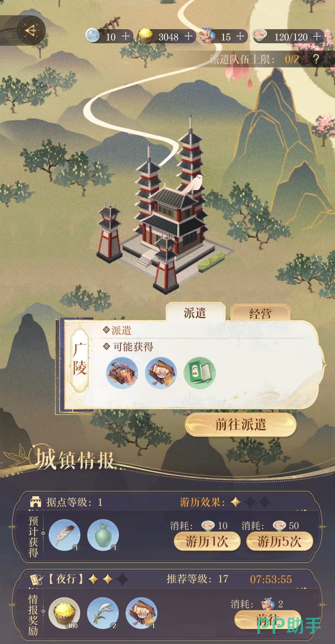 在据点中有很多项活动,大家一定要将派遣和游历区分开,游历可以瞬间获得奖励,但派遣需要消耗一定的时间,在进行派遣的时候可以手动选择不同的时间段。从一个小时到8个小时可以任意选择,每一小时会消耗10点体力,大家也要将派遣纳入到自己的体力管理中,这样才能合理进行分配。不同的据点派遣获得的奖励也有所不同,即使同一个据点里,不同的线路也有着不同的奖励。例如在广陵据点中,一共有三个线路,除了必定会掉落的粟米和经验之外,还有建筑材料箱,广陵密报和礼物包等不同的奖励。