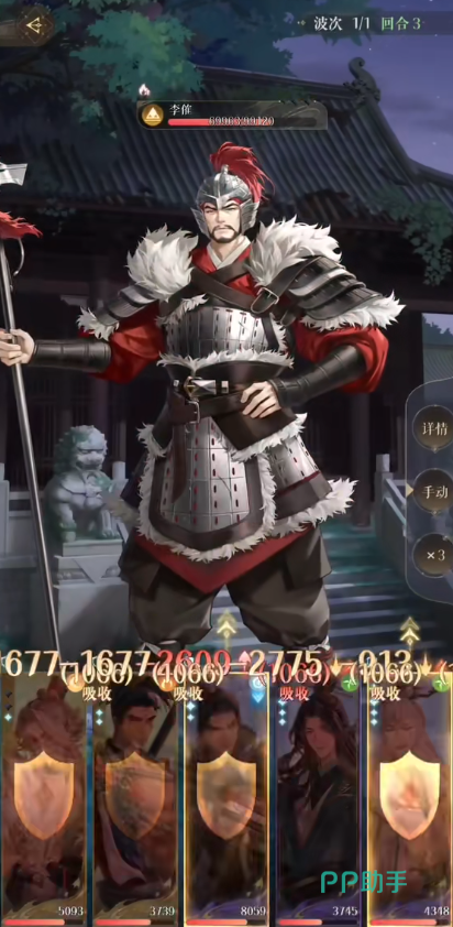 第2回合杨修放大招,即使没有暴击也没关系,颜良的嘲讽盾不开。第3回合李傕满能量即将进行高额群体攻击,这一回合队伍切记全员防御,即使大招的能量满了也不放。