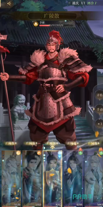 后期打法就是每三回合下拉防御一次李傕大招,因为这个队伍里面没有王粲分摊伤害,因此推荐颜良的大招留着在整体血量较低,且史子眇3点能量时启动,可以更加稳定续航。
