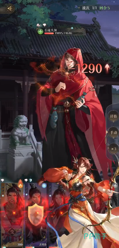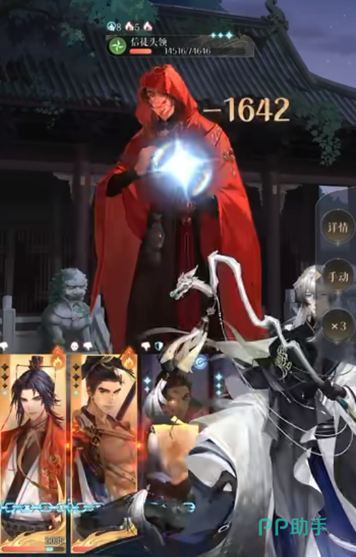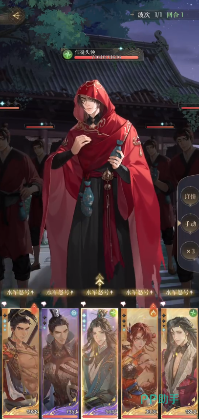首先第1回合~2回合让陈登先放广陵散给吕蒙添加一点能量,如果能刷出变身,就能在一回合内把血量较低的回复兵清理掉,其余角色集火信徒头领BOSS。其后群攻清理小怪,其余密探有大就放。关键是第4回合信徒头领放大招,全员除盾以外要下拉防御。