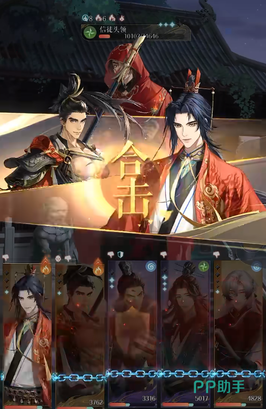推荐大招的释放顺序是王粲→吕蒙→陆逊,经过两个回合火种的叠加,吕蒙可以在一个回合把加血的加兵全清理掉,陆逊夷陵火大招再补上一层火种抵达火烧连营。陆逊和吕蒙普通攻击时还有几率触发羁绊合击,增加火攻伤害值。新手玩家也不需要额外花心思记场上的火种数目,因为信徒头领的状态条上方已显示他的增益buff与火种数目,每累积5层引爆一次就很简单通关。