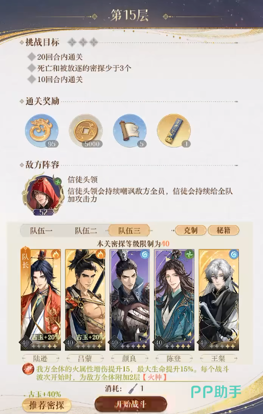地宫15层的三个挑战目标是20回合内通关、死亡以及被放逐的密探少于三位、十回合内通关。敌方阵容是52级风属性的信徒头领,还有4位血量不高的风属性信徒小怪。信徒头领具有非常棘手的全体嘲讽技能,4位信徒在场会给全队增加攻击力,因此必须在前2回合一次性使用群攻技能清理掉BOSS背后的小怪。推荐挑战地宫15层的队伍整体等级40级加5修为,小编有以下的阵容推荐: