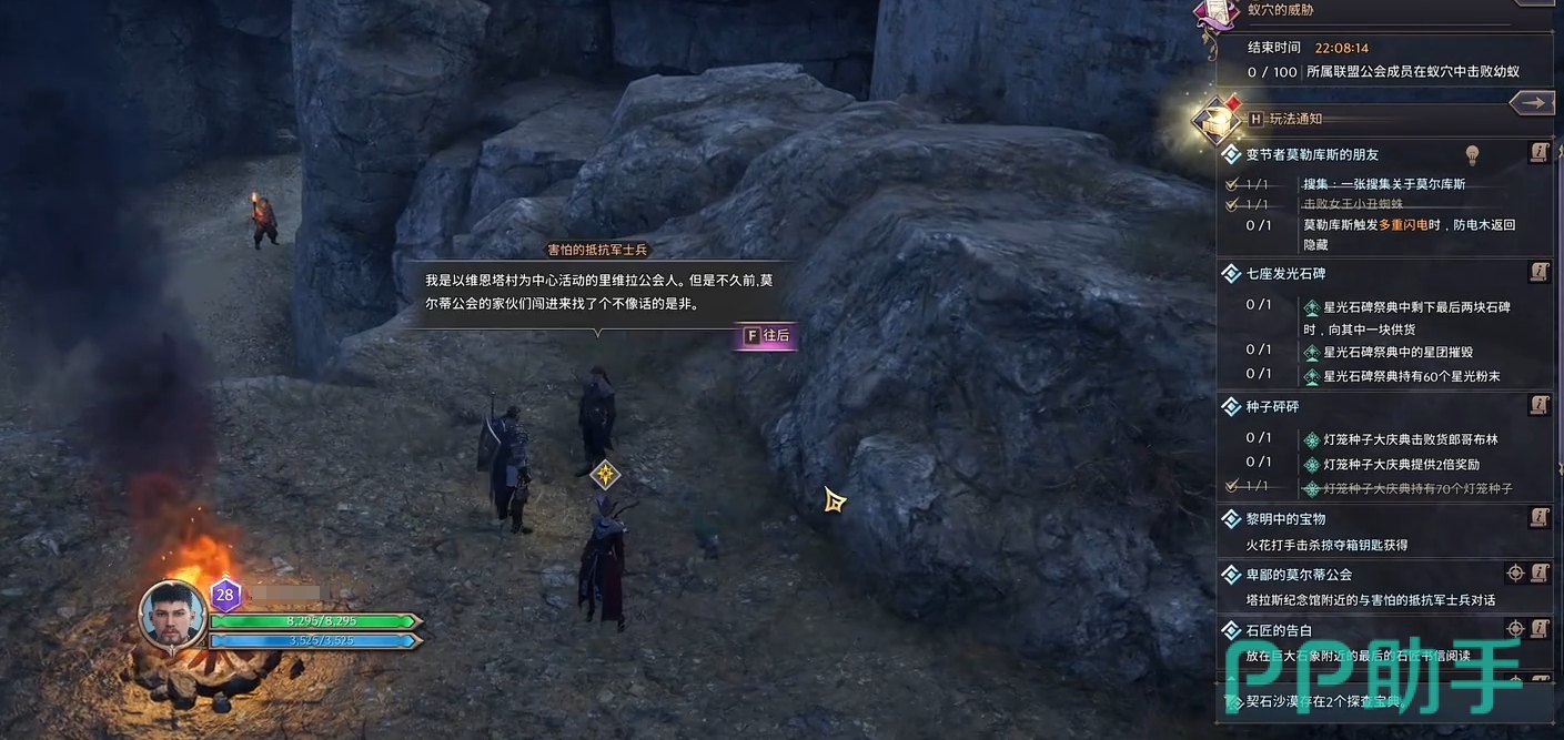 第二部分任务可在地图上找到火葬场这一传送点接取,之后跟火葬场工人对话并调查火葬场尸体,然后前往契石沙漠击败10只沙漠眼镜蛇,击败后去火葬场北方收集三个抵抗军标记,搜集完成后回去找火葬场工人交任务即可。