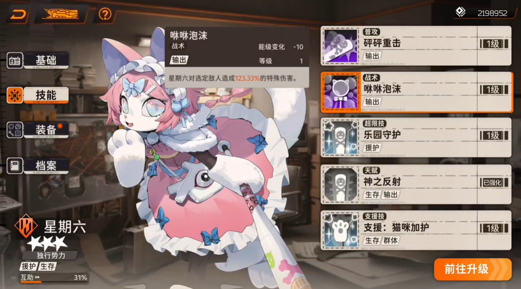 接下来要介绍的是星期六的战术技能“咻咻泡沫”。它不仅名字有趣,实际效果更是相当出色。星期六通过这一技能能对敌方单体造成184.98%的特殊伤害,而能级变化为-10,这个技能的高伤害输出让她在战场上能迅速削弱敌人的战斗力。虽然这个技能需要一定的能量消耗,但当玩家策略性地使用它时,往往能在关键时刻扭转局势。