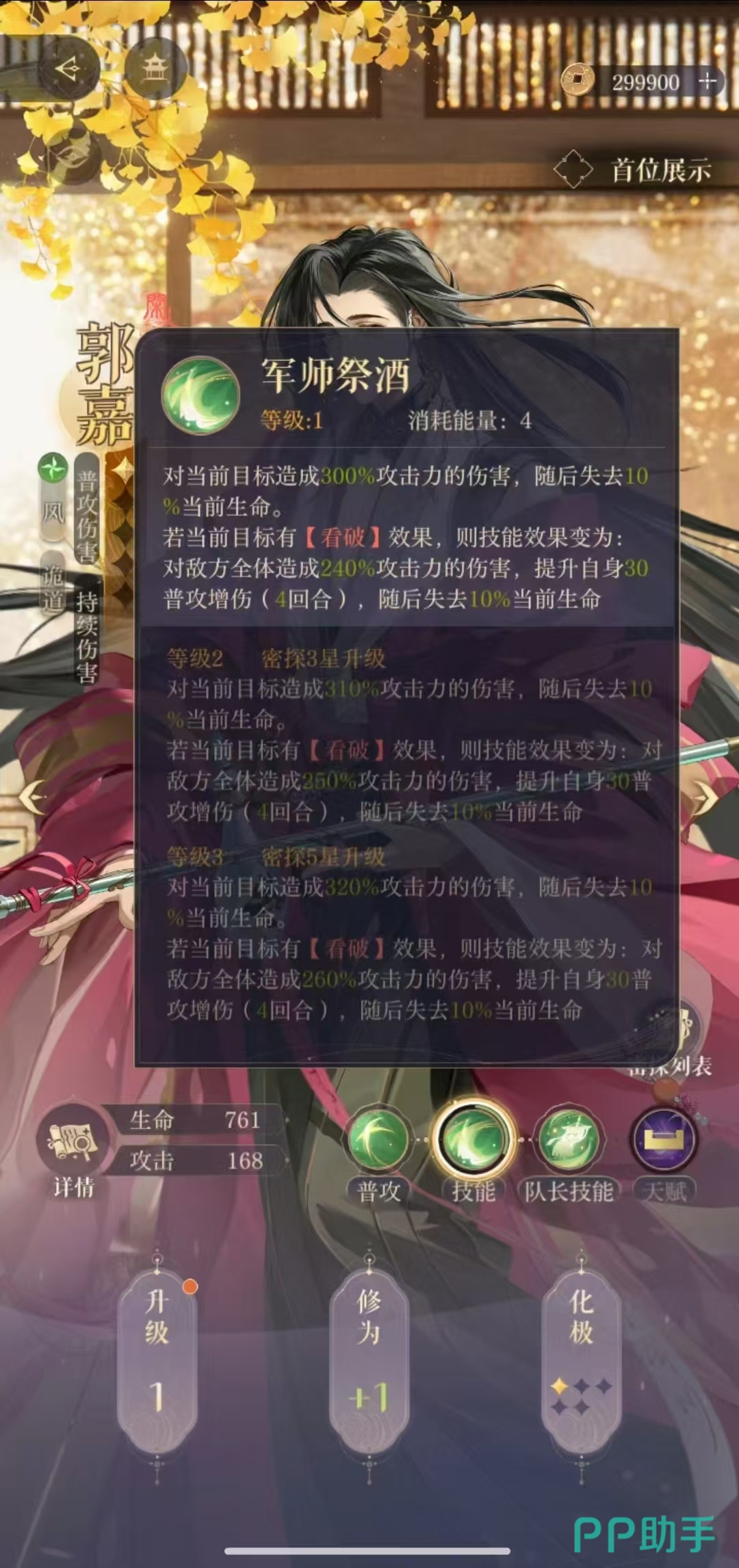 这里需要注意的是如果郭嘉队附加看破效果的敌人进行攻击,再释放该技能会变成240%的攻击力伤害,但是自身的普攻增伤能提升30点大幅度的提高,持续效果4个回合,在结束之后损失10%的生命。虽然会被看破,但是普攻伤害增加郭嘉是吃普攻伤害的角色也不是很亏。