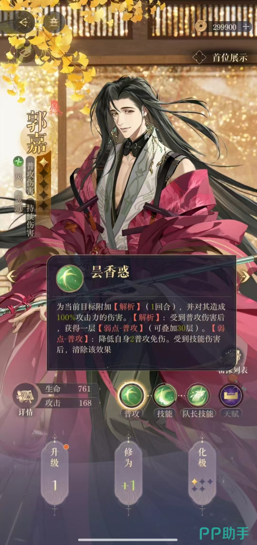 首先我们来看郭嘉的普攻,郭嘉该角色是吃普攻技能的,所以郭嘉的普攻技能是比较出挑的,郭嘉的普攻对敌人的buff状态是能够持续1回合,并且对敌人造成大量的攻击伤害。解析是郭嘉的一个buff赋予状态,在被解析赋予的敌人身上受到普攻伤害,会获得弱点普攻叠加能够提高郭嘉普攻免伤度。
