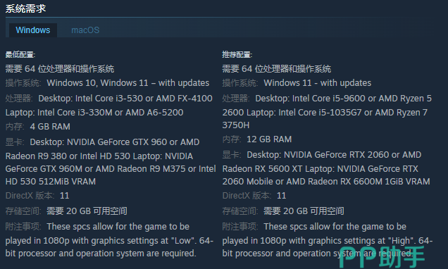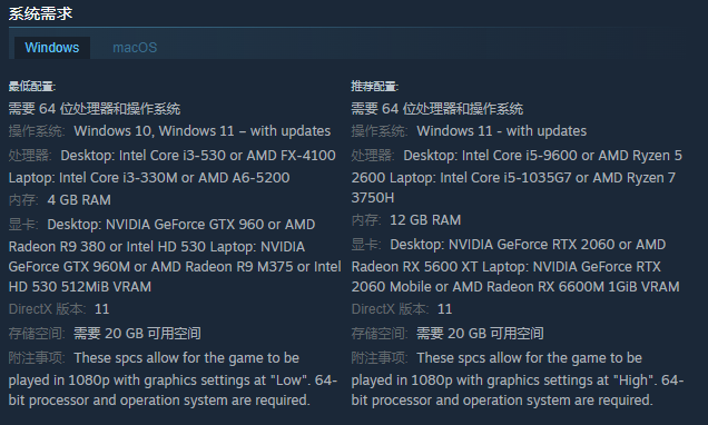为了确保玩家能够流畅地体验,首先大家的电脑需要满足于64位的win10或者win11的系统,而处理器就得达到i3-530或者FX-4100了,显卡则要达到GTX960或性能差不多的A卡,运行内存达到4G以及拥有足够的储存空间以后我们就能以最低的特效来运行此游戏了。