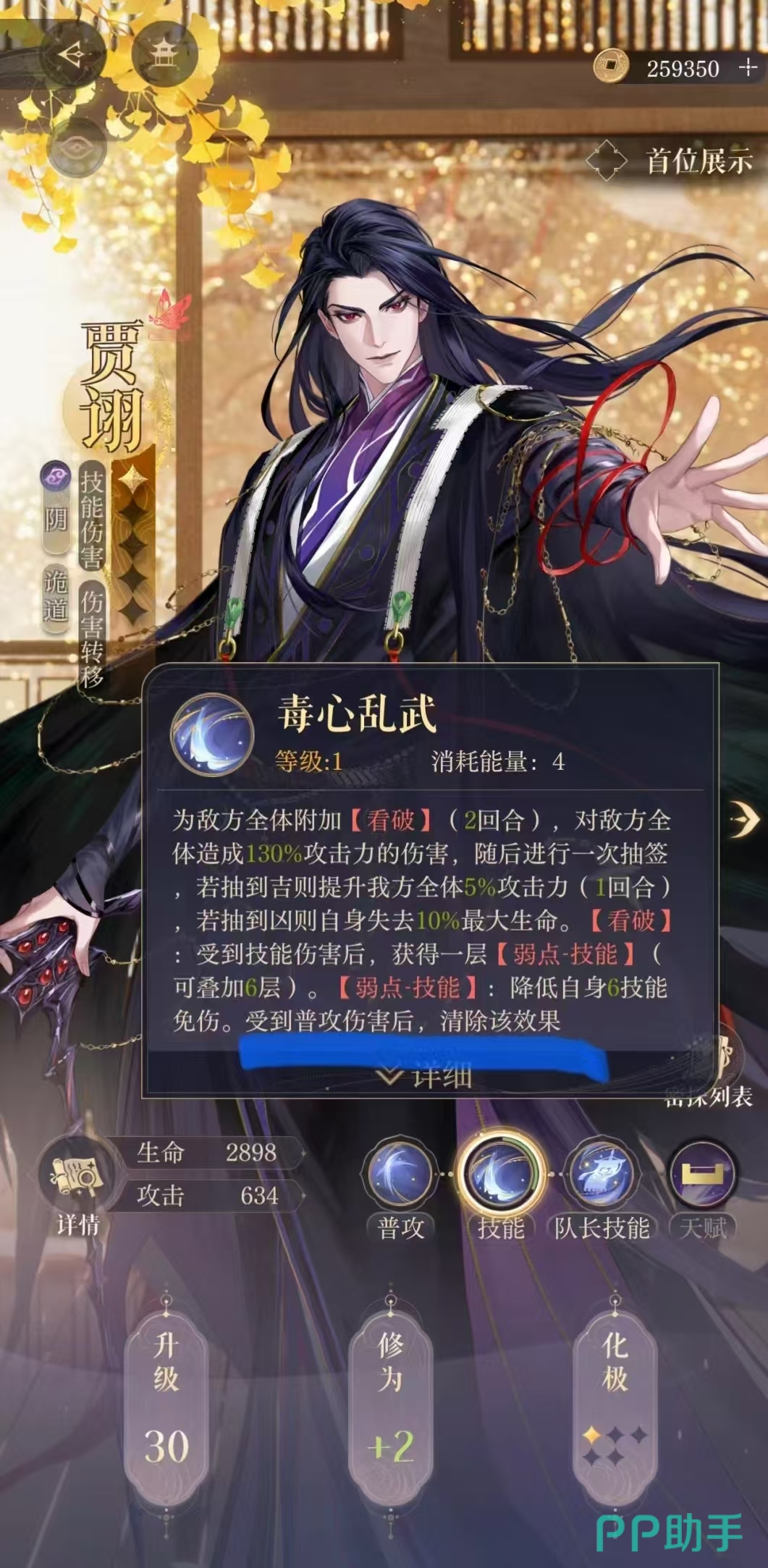 如鸢贾诩在有中的定位是诡道职业,在游戏中拥有一下特殊的技能战斗机制。在游戏中如鸢贾诩是阴属性的角色,他的核心技能机制是伤害转移。根据这个技能机制来看,贾诩在有中科院当做副c和辅助的方向进行培养。