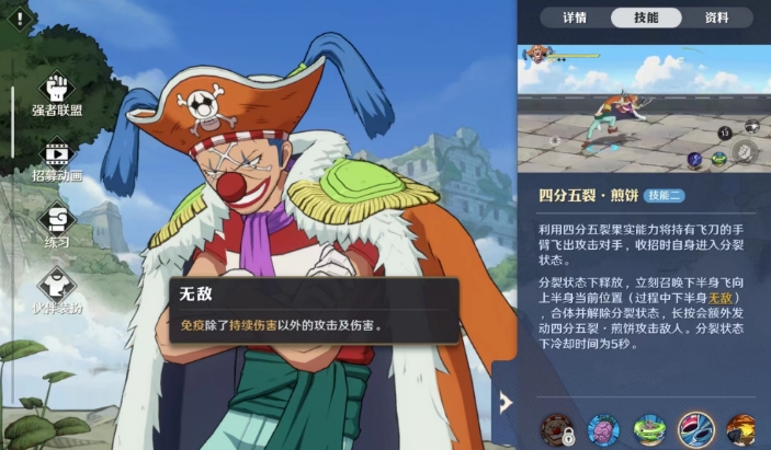 巴基的被动技能其实才是他的核心所在,这个技能能够让他进入分裂状态,在这种状态下,他的上下半身都可以进行独立的操作和攻击,这也是增加了他的战斗灵活成都,大家在使用这个角色的时候是可以通过巧妙地切换分裂与合体状态,并结合精准的走位来进行输出的,而且根据技能巴基可以快速打出高频伤害,这种战斗方式不仅考验了玩家的操作能力,更体现了巴基技能跟动漫中的一些重现效果。