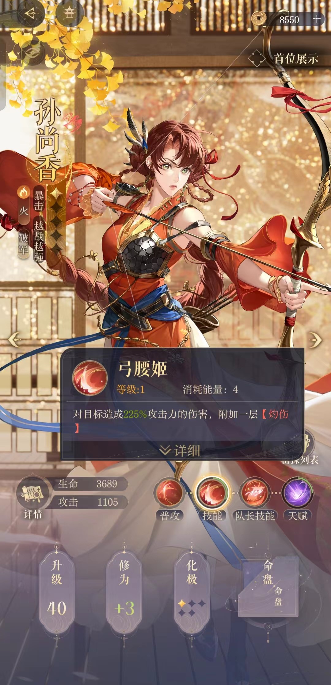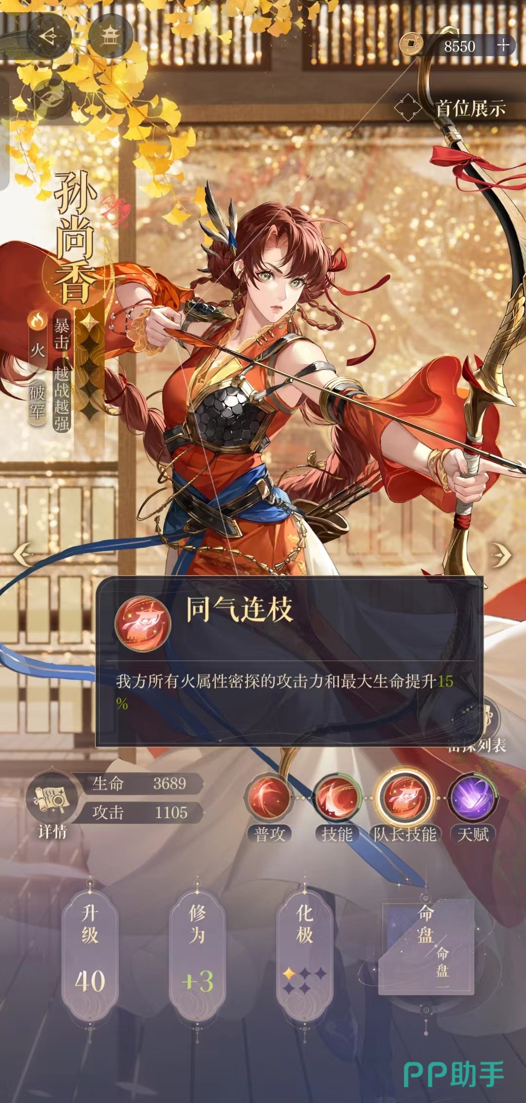 孙尚香的技能“弓腰姬”可以对敌方造成225%攻击力的伤害,还能附加“灼伤”效果。孙尚香的队长技能“同气连枝”可以增加我方火属性密探15%的生命和攻击力,因此在队友的选择方面,如果要将孙尚香作为队长的话,可以尽量多选用一些火属性的密探,以确保将孙尚香的队长技能价值发挥到最大。