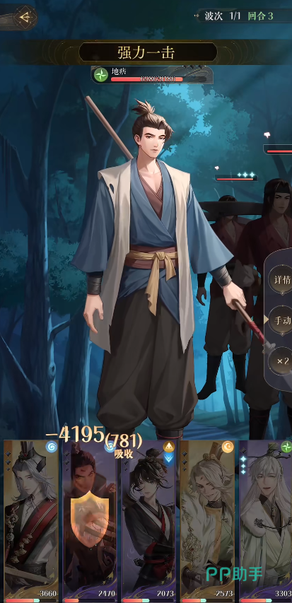 第3回合,杨修先对地属性小兵开大招,然后阿蝉对水属性小兵开大招,触发追击伤害就能够收掉下一个地属性的小兵。第4回合全员都扛过一轮群体大招,史子眇要及时大招回复,如果血量过低在1000左右,那么建议这回合其他人都防御。