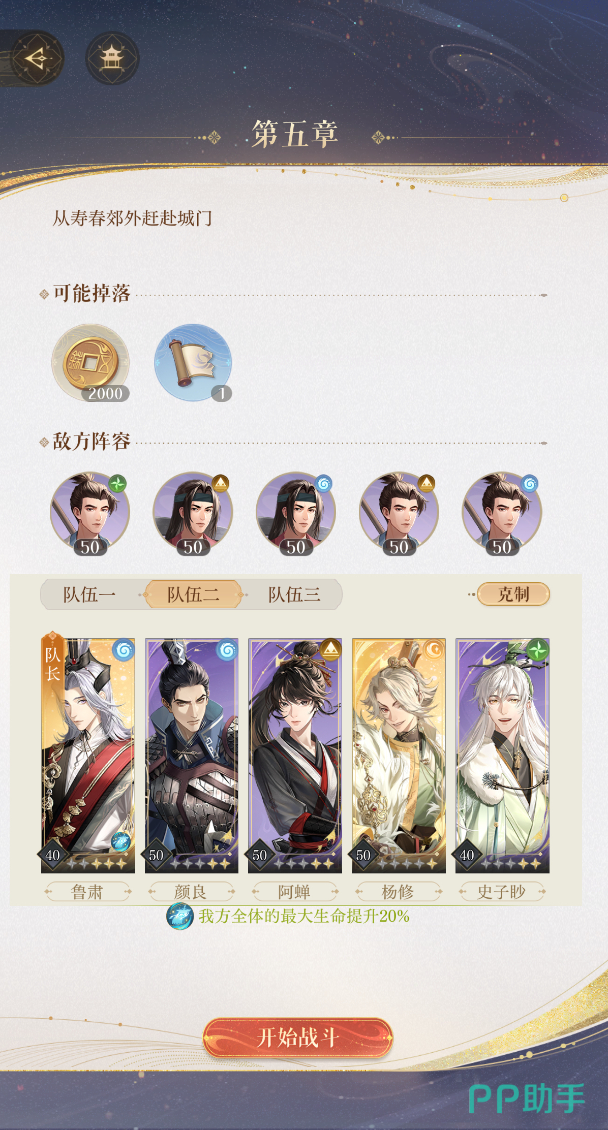 5-6关卡的敌方阵容是江东地痞,一共有5人,分别有两名地属性、一名风属性、两名水属性,等级均为50级。推荐阵容:鲁肃+颜良+阿蝉+杨修+史子眇。这套是平民低练度的阵容,鲁肃是卡池第1发10连必出,杨修做新手7天任务就送,其主输出手阿蝉,推荐在卡池里面捞一个二星比较好。