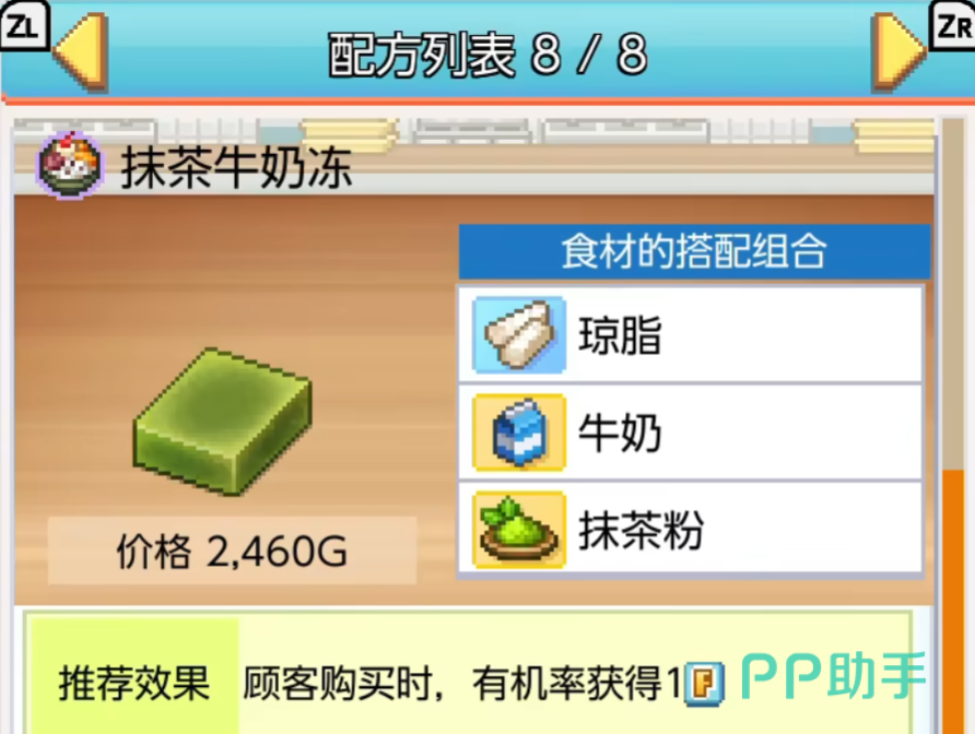 如果大家更喜欢抹茶牛奶冻的话,便可使用牛奶琼脂以及抹茶粉。共同合成一个抹茶牛奶冻,若将其成功卖出的话,还有一定的概率获得一个“f”。能够帮助你解锁新的菜单,又能快速打造更多的分店。