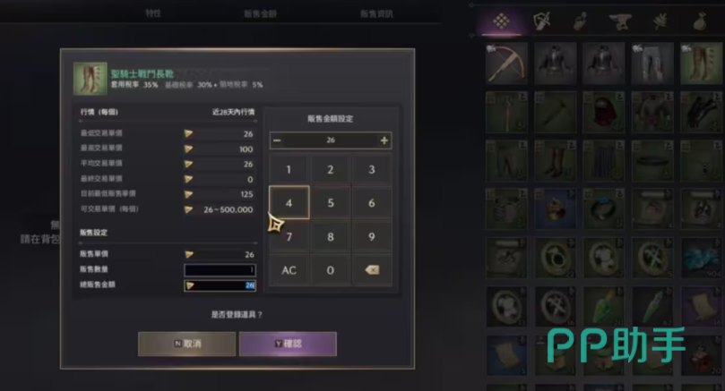 这里的上方能看到“贩售”的选项,点击后,右侧会显示你背包中的物品,我们再点击想要出售的装备并且输入合理的售价,成功售出就算搬砖成功了,玩家可以用这些收益来购买更高级的装备,从而在困难任务生存下来,获得更高的回报。