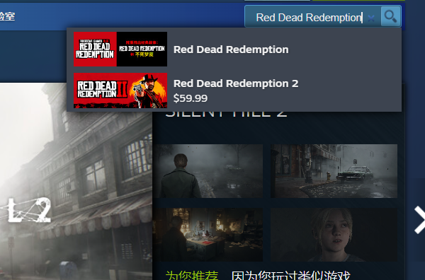 当我们打开steam平台的商店搜索,尝试搜索荒野大镖客这几个字的时候会发现并没有出现搜索结果。这是因为这个系列是由美国工作室制作发行的,因此我们需要将它的名称转换成英文,再进行搜索。