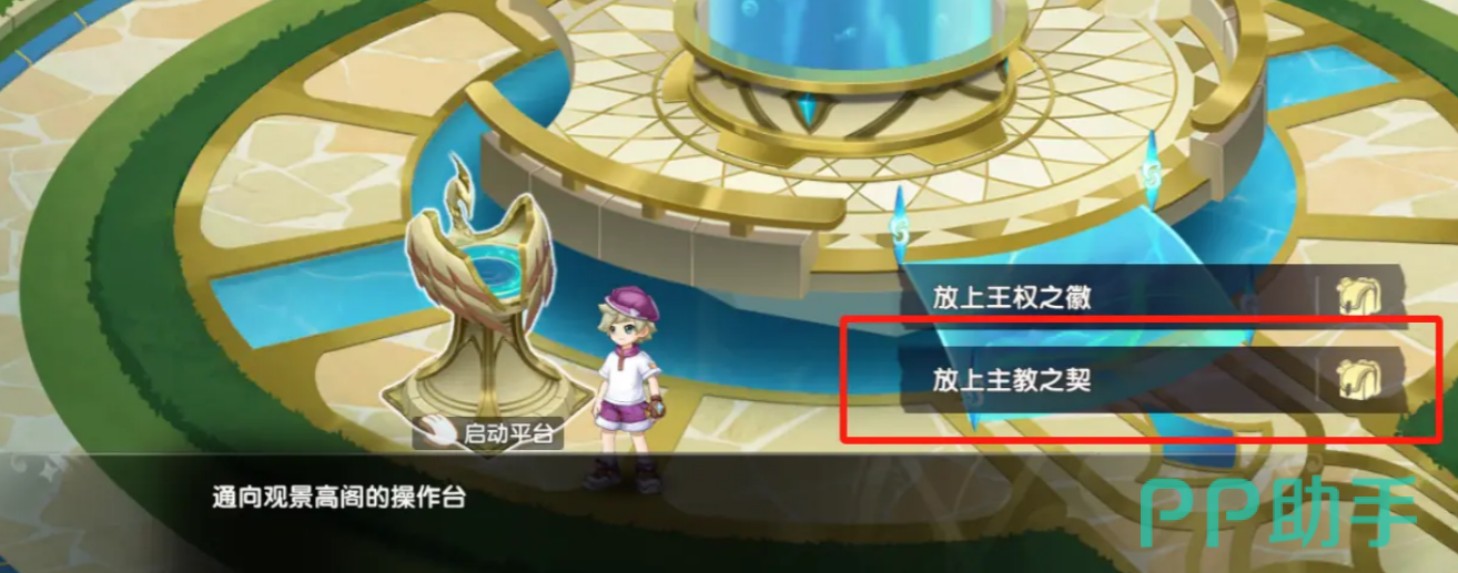 在取得主教之契之后,玩家必须再次返回永恒梦境第六关:观景高阁。此前完成的挑战会使你更加熟悉这个关卡的每个角落。在这次回到高阁后,玩家依旧要按照原来的流程推进,先打败“青空翼卫”,再来到启动平台。然而,与上次不同的是,这次你会在平台上看到一个新的选项——“放上主教之契”。