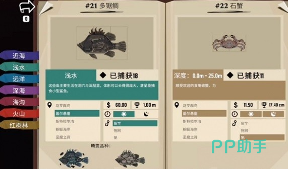 如果抓鱼时水花呈现的是五彩的颜色就证明捕捉到稀有的变异鱼种,如果是转盘中出现金色块我们就能捕捉到奖杯鱼,这个鱼除了能卖出高昂价格外,也会被记录到图鉴中,另外捕鱼时还要注意几个条件,那就是对应水域的捕捞位置、鱼类出现的地区位置,这些都可以通过图鉴来查看其中的一些讯息。