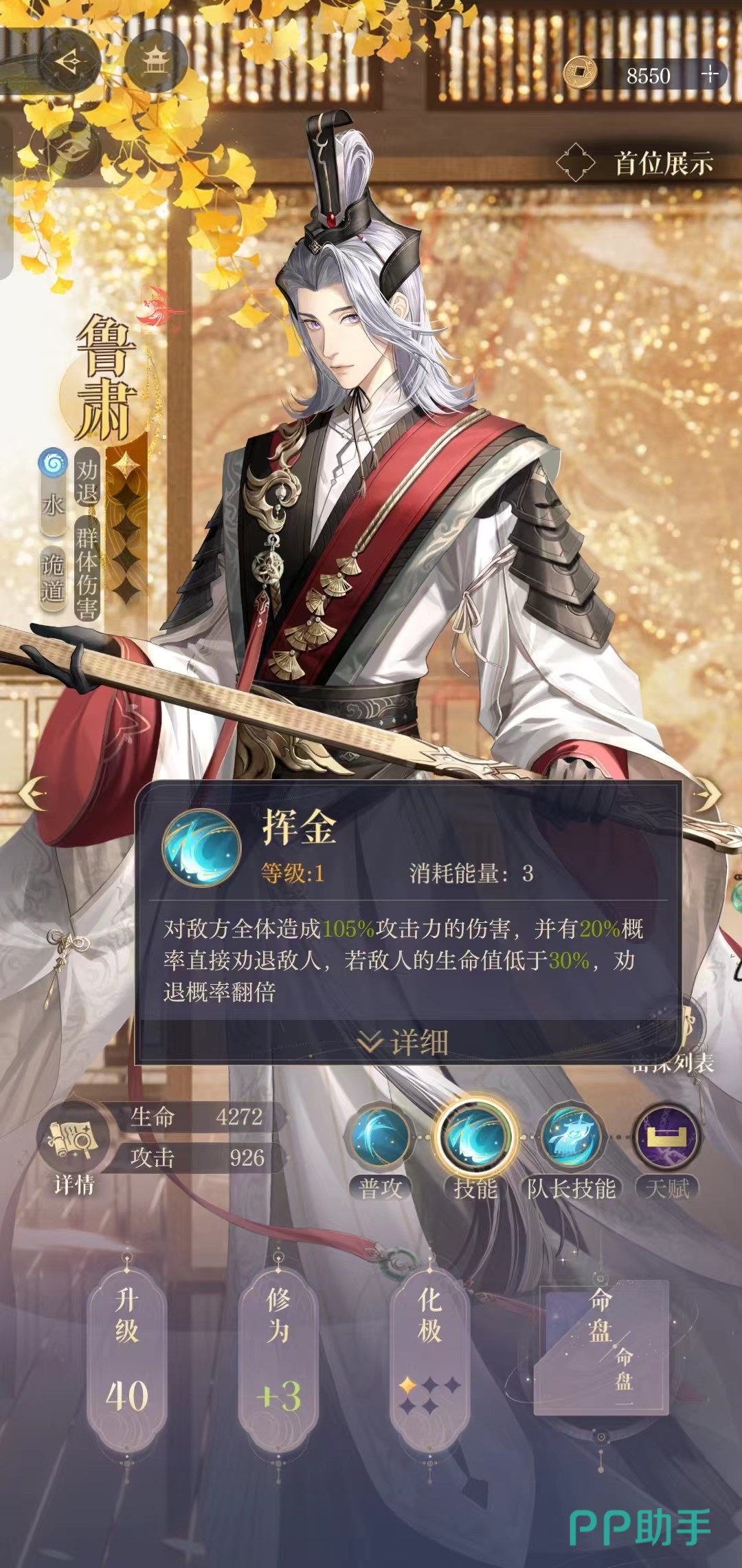 鲁肃的技能名为“挥金”,是一个非常强有力却看运气的技能。“挥金”会对所有敌人造成105%的伤害,并且有20%的几率可以劝退敌人。如果此时敌人的血量低于30%,劝退敌人的成功率将会提升至40%。每当“挥金”技能提升一个等级,“挥金”对所有敌人的基础攻击都会增加5%,最多可以造成115%的伤害。