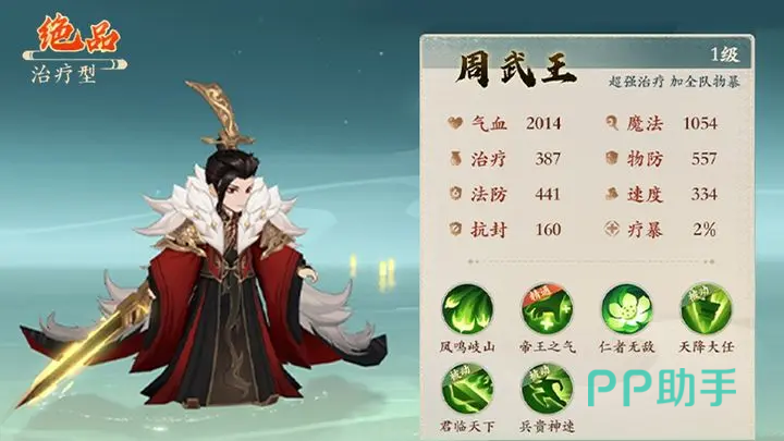 了解封神的小伙伴们对周武王想必都有知道,虽然他是一代帝王,但是其实在武力值方面时逊色于很多神将的,他的技能特点就在于用人,用仁。在游戏当中,周武王也是这样的,他是一个绝品级别的治疗型的伙伴,他拥有超强的治疗技能,能够同时对多个队友进行治疗,在配合被动之下,能够对己方进行多次治疗,甚至能在关键时刻复活队友,逆转战局,尤其是在物理系的编队中,对于队伍的加成作用很强。