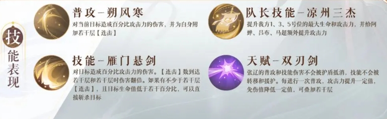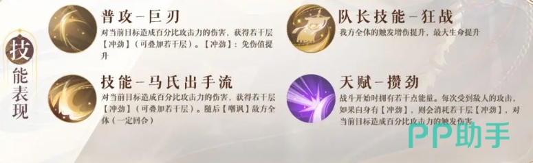 此外张辽的队长技能也相当实用,他主要针对不同的位置的队友进行一定程度的加持,自身输出在线的同时,对于队友还有不同程度的增益效果,这样的设计让张辽在团队中的作用更加突出,能够为整个队伍带来更多的优势,而马超作为绝密品质的密探,技能效果确实令人瞩目,当能量积攒满之后,他能够对当前目标造成高达410%攻击力的伤害,这一伤害数值在众多密探中可谓是相当出色,同时他还可以获得4层冲劲,之后更是能够嘲讽全体敌方两回合。