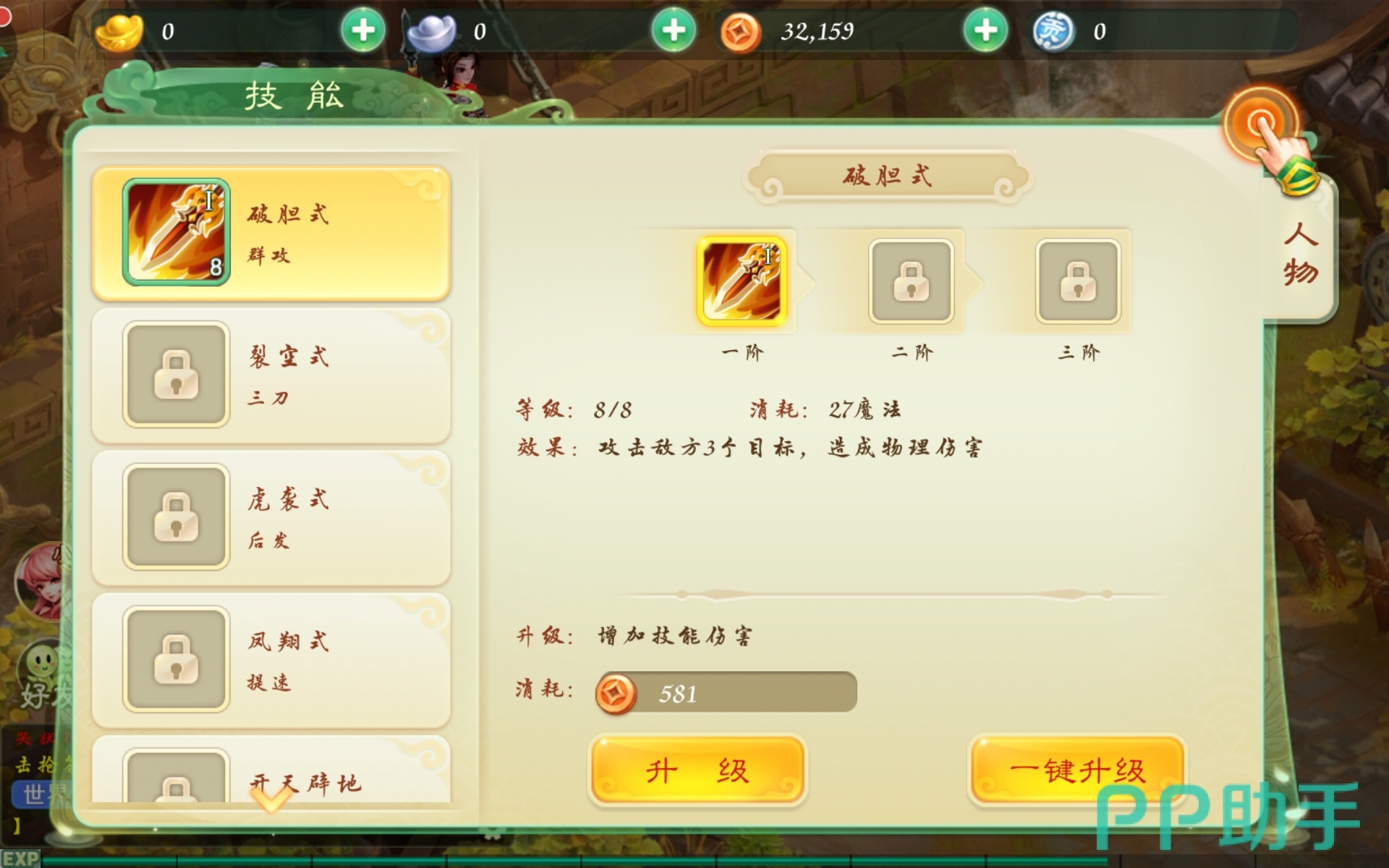 而当玩家达到8级时,就可以解锁技能面板了。在技能面板中,玩家可以查看自己与拥有的技能。通过一键升级的方式可以提升技能的等级,增加技能的伤害。人物的技能等级是无法超过人物自身的等级的。