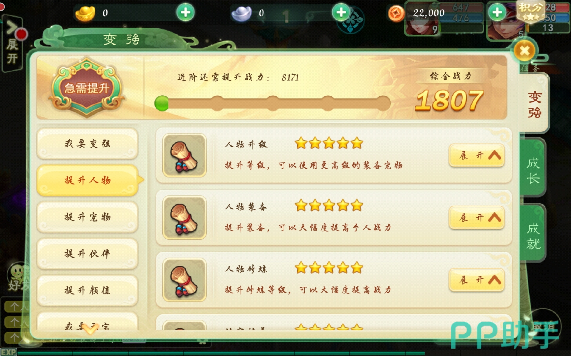 当玩家想要提升自身战斗力,却无从下手时。可以点击主页面中的“变强”按钮,在此页面中,有很多方法可以快速提高战力!