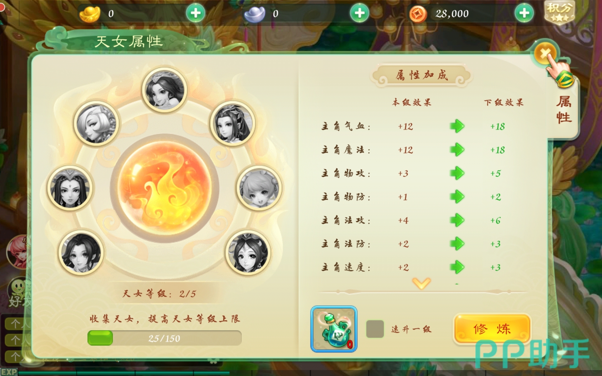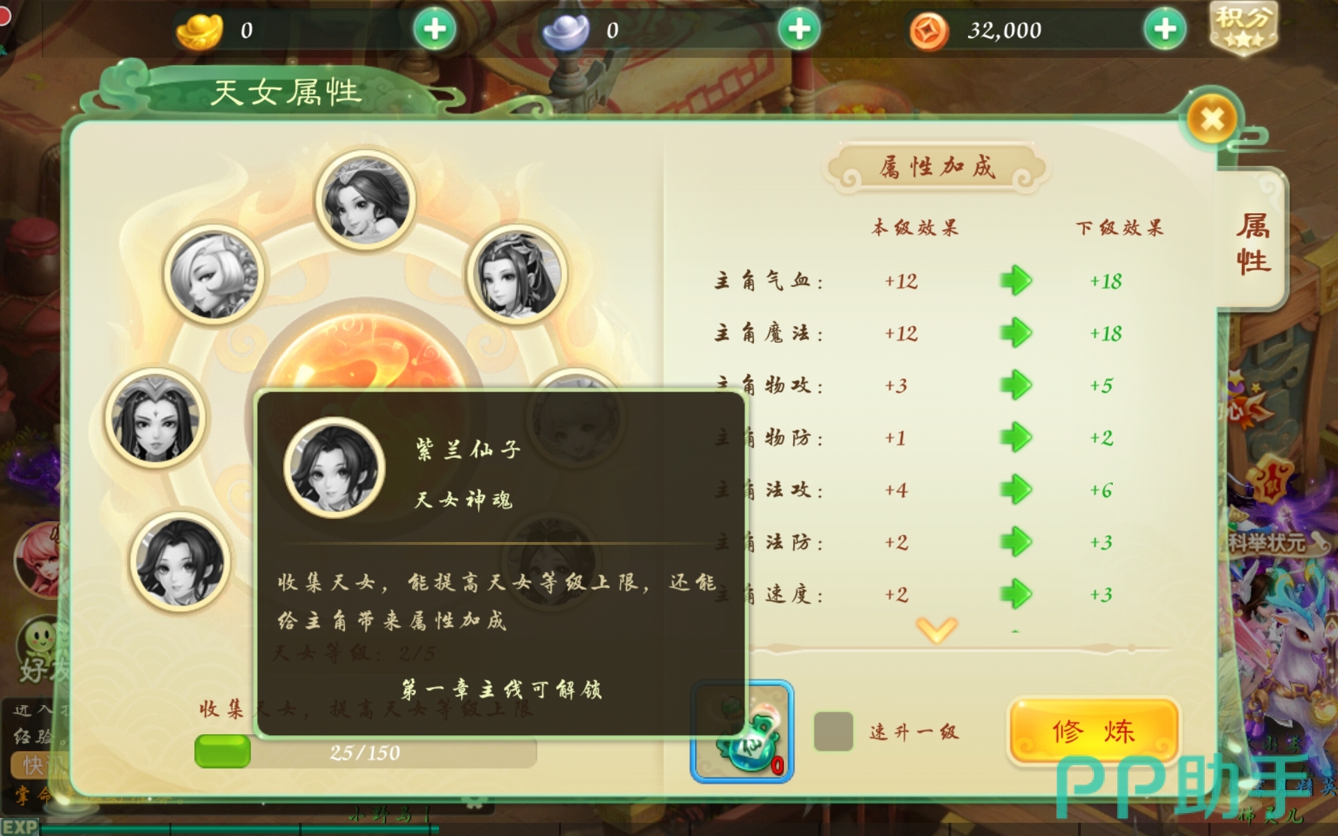 玩家人物等级达到7级时,系统会解锁天女。游戏中玩家可以通过不断修炼“天女”的等级提升自身各方面的属性。天女系统的初始等级为5级,玩家可以通过不断搜集天女提高天女系统的等级上限!点击各个天女的头像可以查看获取方式。