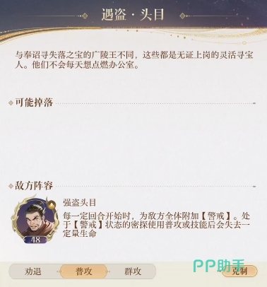 在命盘方面,陈登可以开启2能量,或者用杨修利用他自带能量来赌开局,这样操作起来十分方便,如果阿婵的伤害不足,那么就需要其他输出角色来提升练度,至于命盘中的陈登,完全可以使用初始状态,无需额外培养,在这个挑战中,玩家需要面对一个特殊的敌人强盗头目,这个敌人具有一项独特的效果,每经过一定的回合数,他就会为敌方全体附加一种名为警戒的状态。