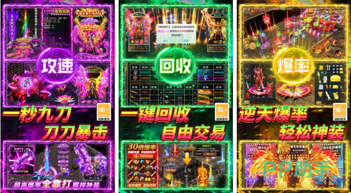 烈火星辰是款爆率超级高的三职业不氪金传奇哟西,加入了套装收集以及装备合成等系统,全新的核心玩法吸引了大量传奇类手机游戏爱好者,最值得大家体验的是“装备回收”系统,每一种无用的装备都可以进行回收并且分解,好多的福利活动也可以让小小白玩家轻松获取梦寐以求的装备武器。