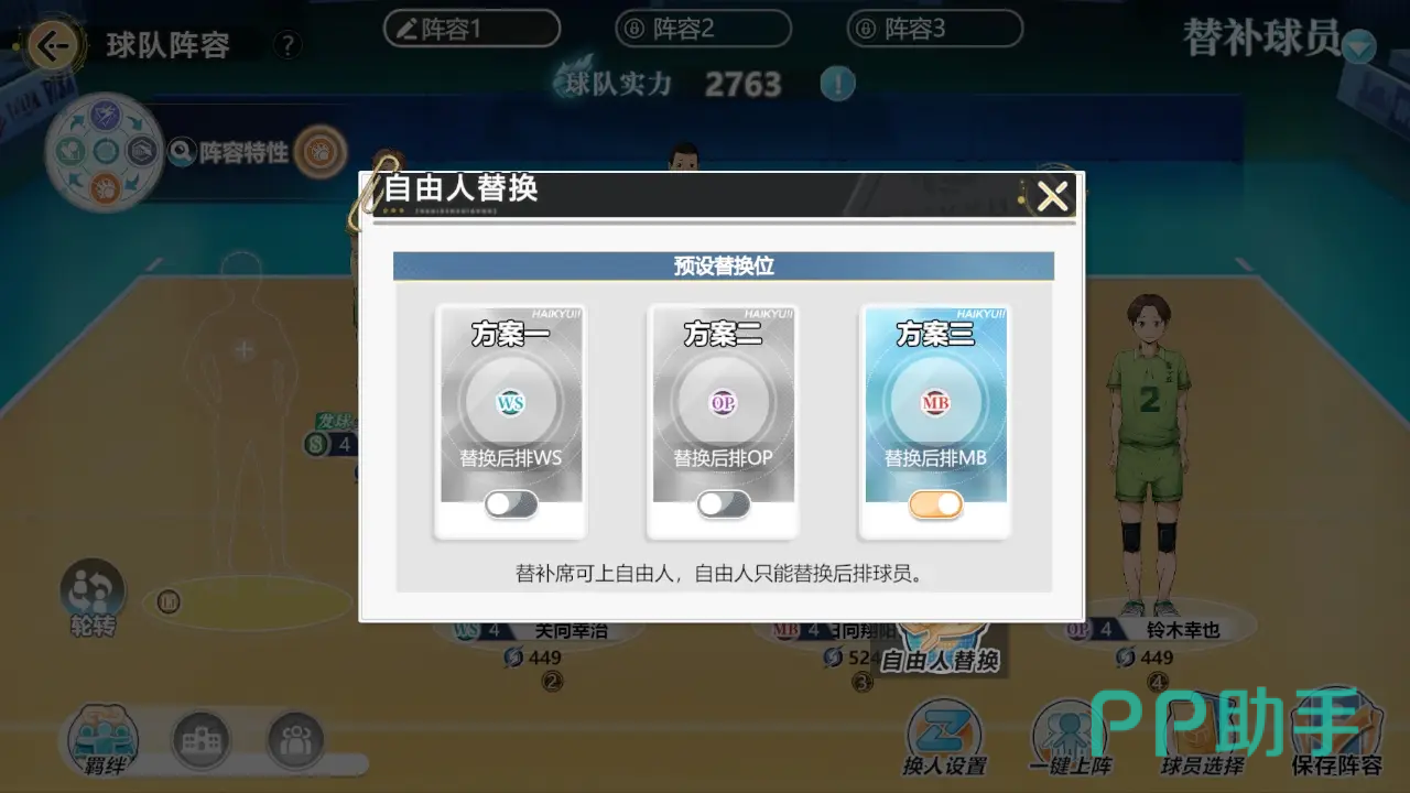 接应:OP,一般是在4号位置,接发球的技巧比较突出,预判能力也相当不错,可以作为一传,选择最好的线路传给二传手,有组织进攻的重任,防守效果也不错。自由人:Li,是6号位置的顶替人选,也是防守核心的存在。