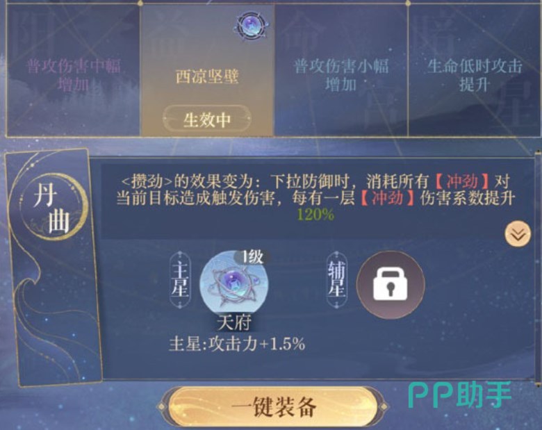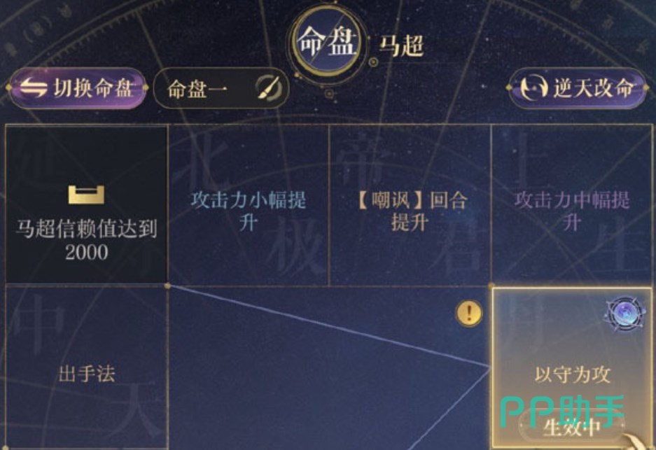而马超的命盘中关键性的命盘有“铁骑当千”,下拉防御获得高额护盾,但自体获得流血。“出手法”,技能不嘲讽但全体增伤提升15%。“以攻为守”,下拉防御的时候消耗冲劲来触发伤害。“西凉铁壁”,最大血量提升,触发增伤提升。