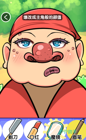 接着就是修眉和涂口红的环节了,细节决定成败。使用眉笔,左滑为他修整左眼眉,右滑修整右眼眉。我们还得再按住它的鼻子,往哪个方向移动都行,再放开,就能够得到一个小小鼻了。然后是关键的口红步骤!右滑嘴巴,给他涂上迷人的红唇,就能瞬间提升小矮人的气场,颜值一下飞跃。按住帽子往右边滑一下,头上这顶帽子就会消失。