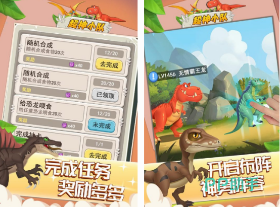 在超神小队这款游戏中,既可以看到可爱又小的恐龙,也可以看到体型庞大的恐龙,因为它是一款可以对恐龙蛋进行孵化的游戏,所以当恐龙刚孵出来的时候是非常小的,在渐渐的长大以后可以组建一个非常厉害的队伍,里面有各种颜色以及长相不同的恐龙,在完成任务的过程中既能获得奖励,也能使恐龙不断的长大。