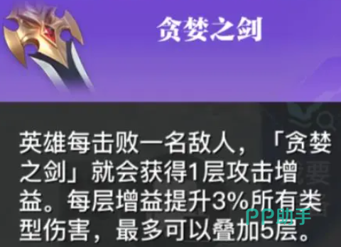 贪婪之剑的效果是当拥有此装备的英雄每击败一名敌人,就让其获得1层攻击增益,这个攻击增益会提升拥有者3%所有类型伤害,这个增益效果不会受到装备属性上限和装备拥有者的影响,最多可以叠加到5层;