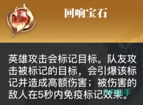 回响宝石的效果是当英雄攻击命中目标后,会给目标增加标记,队友攻击被标记的英雄,会引爆该标记并造成高额伤害,孙尚香搭配这件装备在远程输出,可以配合队友引爆印记,打出大量伤害,迅速瓦解敌人。