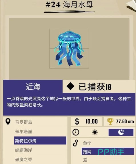 斯特拉尔湾的鱼类比较多,接下来介绍几个比较有代表性的鱼类,首先第一个是海月水母,这个水母非常的漂亮,但是玩家们只可以在近海的晚上才能捕捉到它,我们只能用拖网捕捉,笼子和鱼竿都是无法获取到它的。
