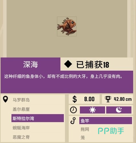 接下来是尖牙鱼,这个鱼类是属于深海鱼,玩家们在深海捕捉到的鱼有不小的概率便是这种,它的优点是好捕捉,同时占用的空间也很少。本身的卖价并不算高,玩家们可以多捕捉一些一起去出售。
