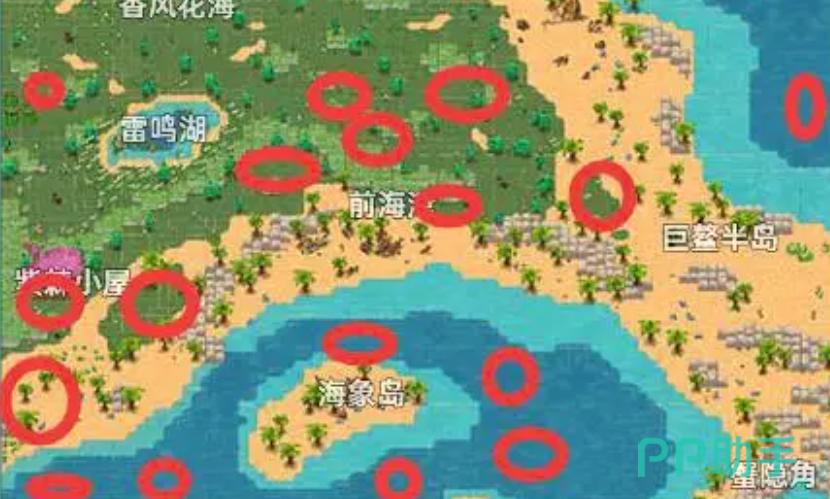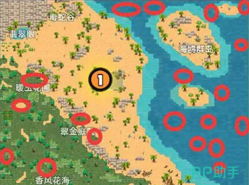 总体来说在这张地图中宝箱还是比较多的,首先小伙伴们可以先搜索一下地图的上半部分,可以看到,在上半张的地图中,大部分的宝箱都隐藏在海里,并且位置也是离得比较近的,大部分都聚集在海鸥群岛下方的小岛附近。左边的宝箱虽然不多,但是都在陆地上,所在的位置也都比较好找。小伙伴们可以通过从上往下,从左到右的方式来进行搜索。