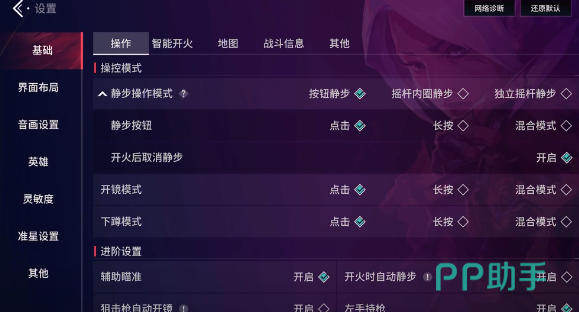 开镜和下蹲模式有点击,还有长按两种,建议直接选择混合模式。辅助瞄准应该打开,拥有较强的辅助性,对玩家而言有许多帮助。