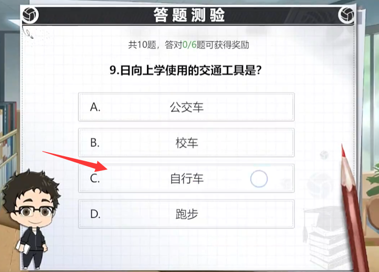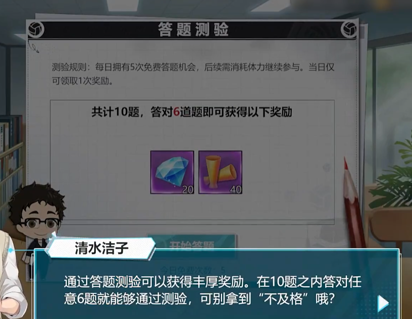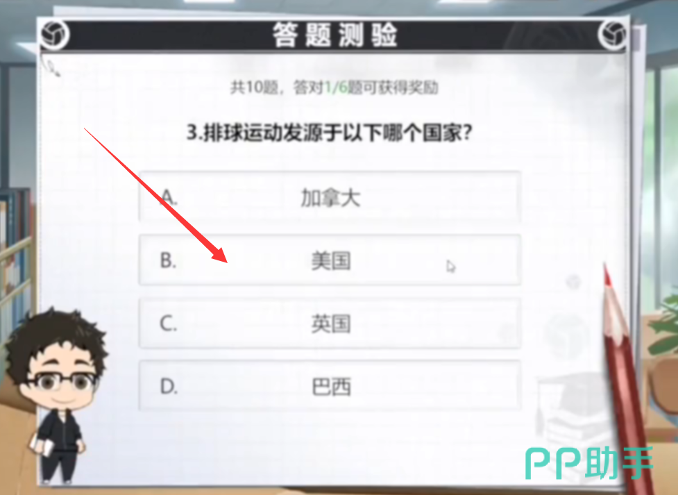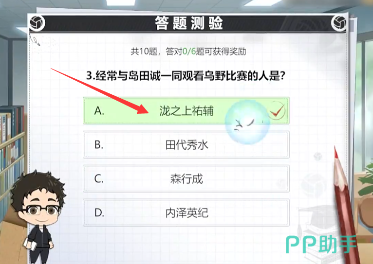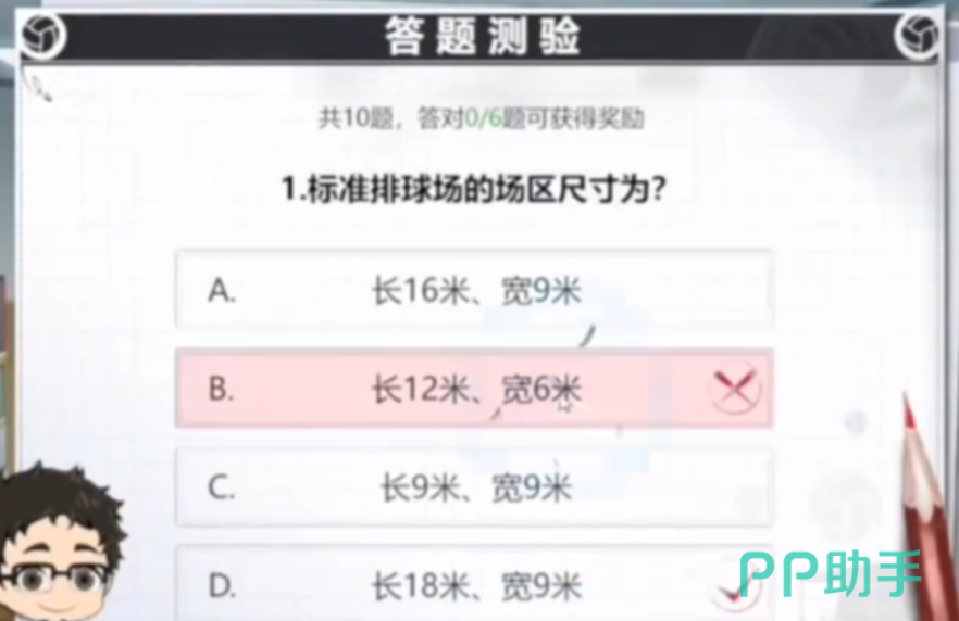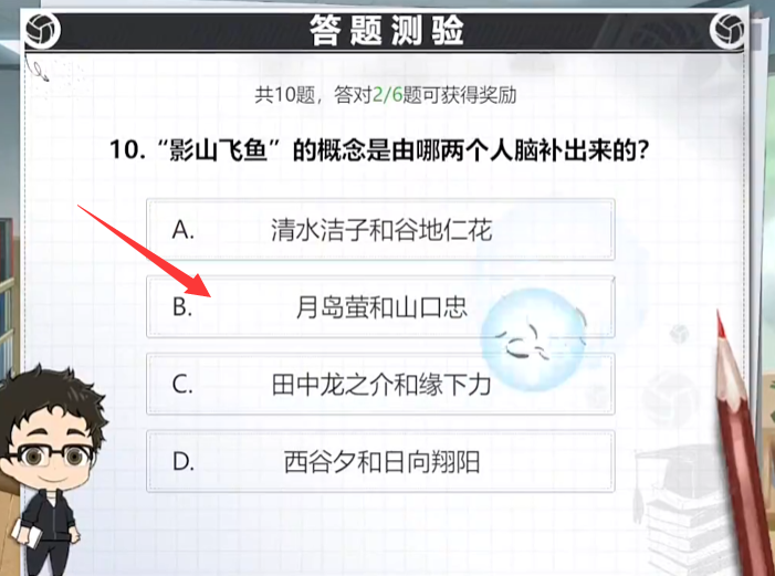 其实这个任务还是属于福利向的,总共会为玩家发布十道选择题,选对六道题即可完成挑战,拿到丰厚的奖励。玩家需要熟悉排球少年的基本玩法规则、战术以及原著中的漫画故事背景。可以通过参与游戏中的排球知识问答、查看角色的背景故事来积累知识。只有对排球少年有深入的了解,才能在答题时迅速准确地给出答案由于题目全随机,接下来小编挑几个比较难的问题分享给大家: