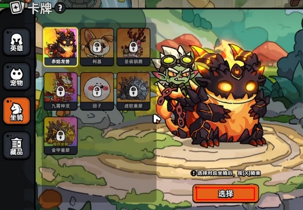选中想要召唤的坐骑后点击选择,可以查看该坐骑的属性和技能效果,比如说这里的赤焰龙兽,它可以加1400移速属性,而坐骑的效果则是提升5%的武器技能伤害,此外还有诸如撞击、受伤获得爆发移速的暴走特性等等。