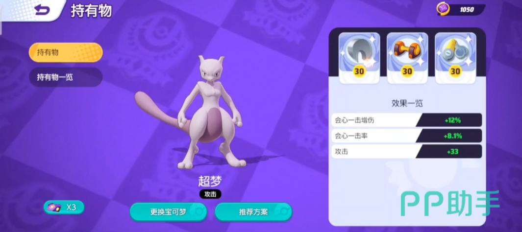 宝可梦大集结超梦带什么持有物好?超梦游戏里面输出能力非常强的一个宝可梦,受到了很多玩家朋友的青睐,作为一个强力的宝可梦,虽然实力已经在线了,但是是可以通过携带持有物这种形式,进一步增项它的实力的,那就有小伙伴比较好奇了,它比较合适带什么持有物呢,一起看看本文的推荐吧。