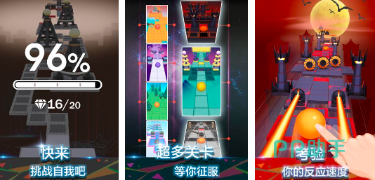 简单休闲益智手游,天空里控制小球前进,所有危险都是游戏失败的元素。前方的赛道上有路障出现或者赛道的周围有陷阱,都导致小球掉落。反应力快速躲避掉,跟音乐的节奏快来滚动小球前进吧!挑战自己征服更多关卡,大家有着极高的反应力哦!关卡背景音乐都很不错,听着音乐舞动自我来滚动小球,在各种地形场景里面挑战。