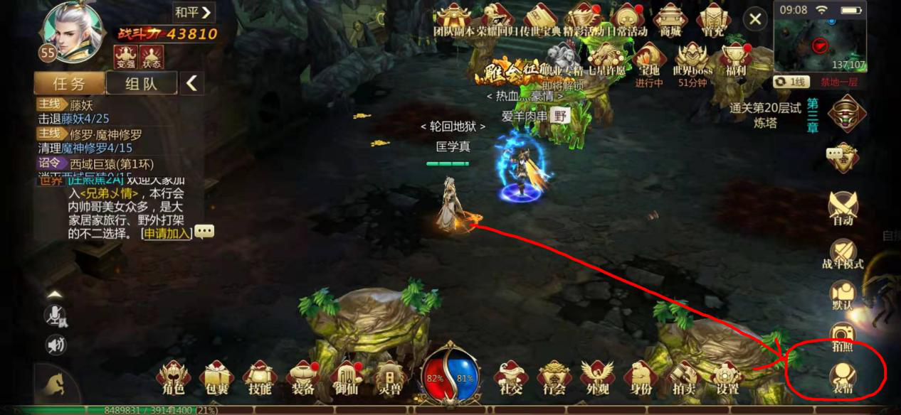点击游戏界面下方的功能键,在界面的右下角有一个黄色的小人状图标,点击该图标就可以打开表情系统了。