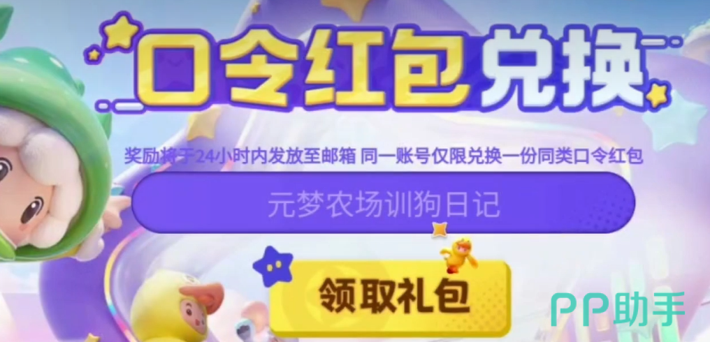 接着,我们需要在这个输入框中,输入这次的专属口令:“元梦农场训狗日记”。然后,再轻轻一点【领取礼包】,三天期限的【甜心果】时装就到手了!奖励会直接发到你的邮箱,记得及时查收。不过注意,每个账号只能兑换一次哦。